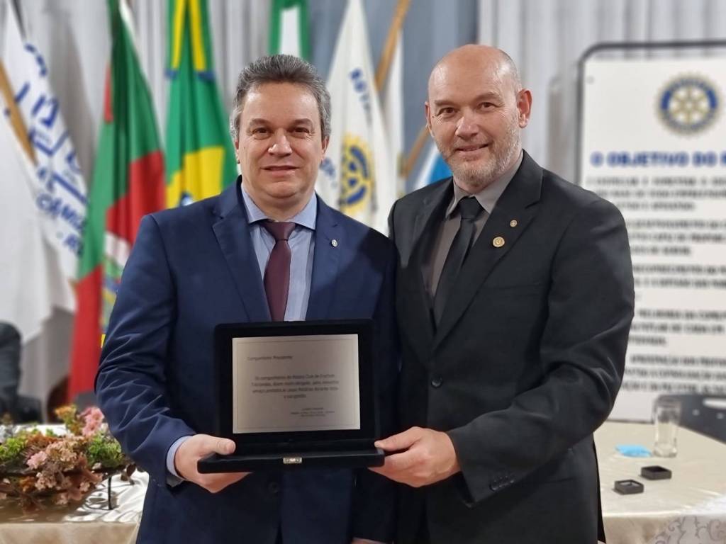 O presidente também recebeu uma placa de homenagem pelos serviços rotários prestados ao clube, entregue pelo companheiro Paulo Roberto Hubner. Além disso, ele recebeu um malhete de recordação, entregue pelo companheiro Laurindo Lucion.