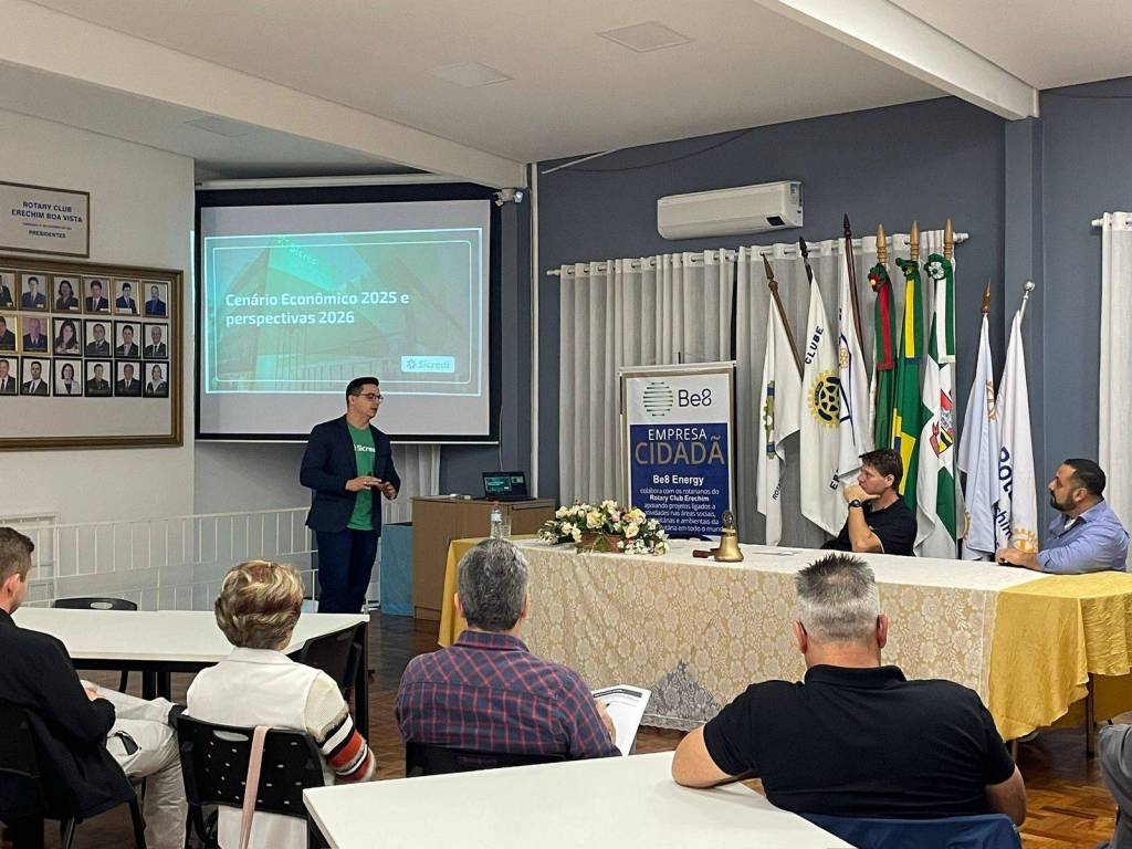 O palestrante convidado foi Rainer Brugnarotto Perondi, assessor de investimentos na Sicredi UniEstados, com formação em Administração e pós-graduação em Finanças. Com ampla experiência no mercado financeiro e certificações reconhecidas na área, Perondi trouxe uma análise aprofundada sobre os cenários econômicos globais e nacionais.