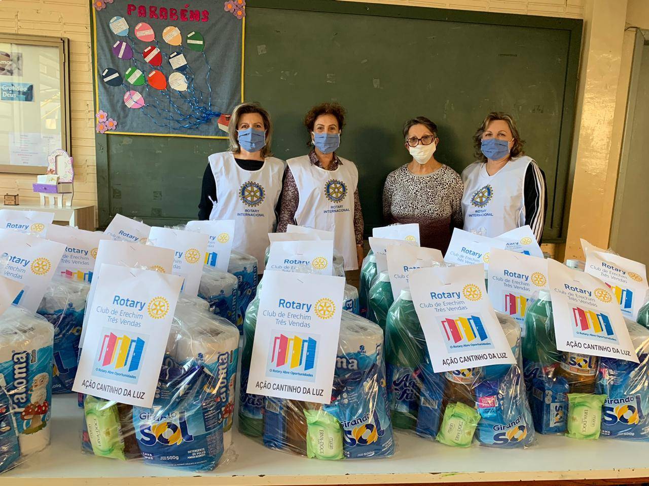 O Rotary Club de Erechim Três Vendas realizou, no dia 03 de agosto de 2020, uma Ação Social promovida pelas esposas e amigas dos associados do clube, na Sociedade Fraternal Cantinho da Luz, com a doação de 32 kits de higiene e limpeza, os kits contém 01 undade de cada item: Água sanitária, sabão em pó, sabão em barra, detergente, papel higiênico e sabonete. Na oportunidade participaram da entrega Helena Maria Badalotti, Maria Glaci Klaus dos Santos e Rejane Bordin.